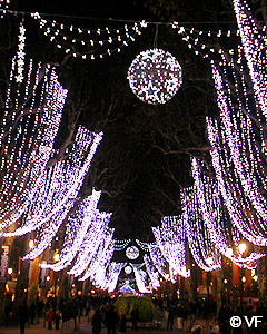 Au mois de décembre pendant le Marché de Noël, le Cours Mirabeau au coeur d'Aix en Provence se pare de lumière et les illuminations lui donnent un aspect féérique. Préservé de la circulation automobile, il est à l'entière disposition des piétons qui flânent et trouvent aussi l'occasion de faire leur shopping de Noël dans une ambiance chaleureuse et conviviale, et la fraicheur vivifiante du mois de décembre à Aix-en-Provence.